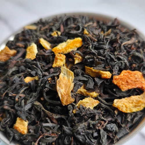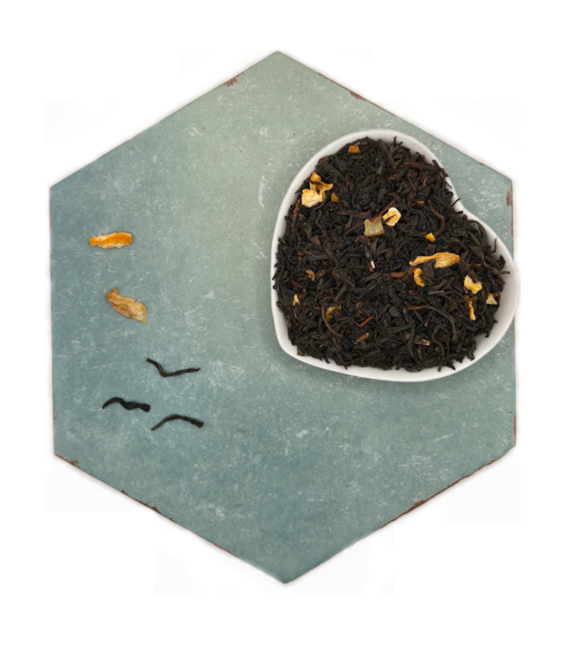 Citrus Noir is niet zomaar een thee; het is een elegante ervaring die de donkere intensiteit van zwarte thee moeiteloos mixt met een levendige citruskick. Laat haar warm trekken voor een verwarmend moment of geniet van een subtiele, verwarmende boost op koude dagen.
